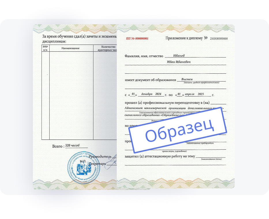 По окончании программы вы получите диплом о профессиональной переподготовке установленного образца, который подтверждает ваше право заниматься новой профессиональной деятельностью. У нас есть лицензия на осуществление образовательной деятельности, поэтому выданный вам документ о дополнительном профессиональном образовании будет иметь полную юридическую силу.