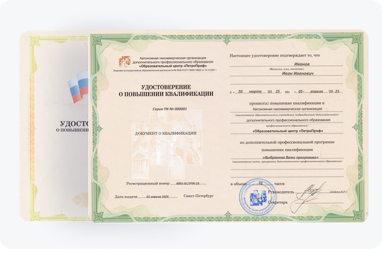 Участники программы получат официальный диплом установленного образца, подтверждающий прохождение курса повышения квалификации.